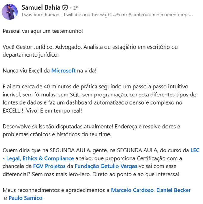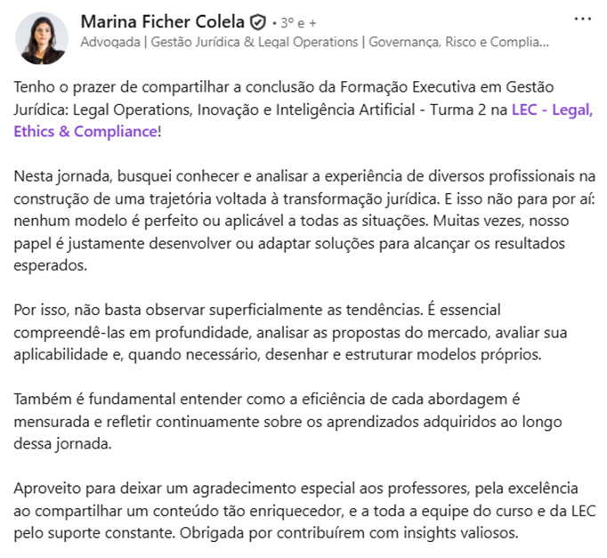 Ao longo de aulas ao vivo semanais, você domina Legal Operations, liderança, transformação digital, inteligência artificial, jurimetria, gestão de riscos, ESG, negociação, comunicação institucional e muito mais.
