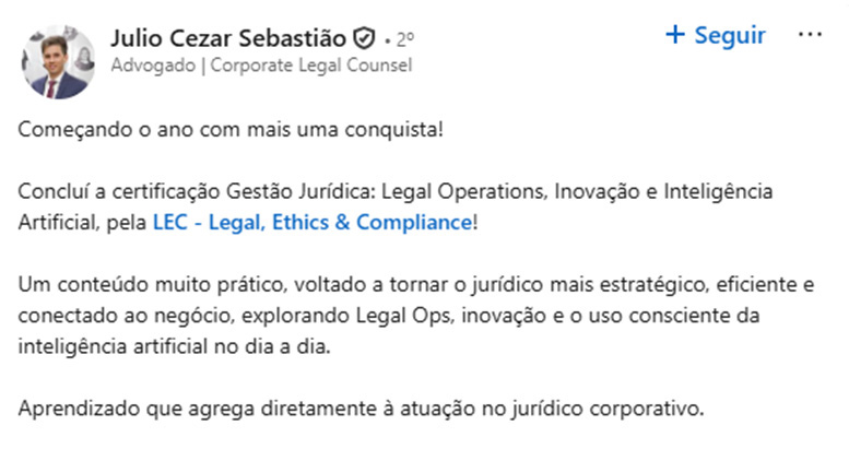 A formação inclui a Certificação CPG-Jur, idealizada pela LEC e operada pela FGV-Projetos — que valida seus conhecimentos e diferencia você no mercado. Ao se inscrever no curso, você fica isento da taxa para o exame, economizando R$ 987.