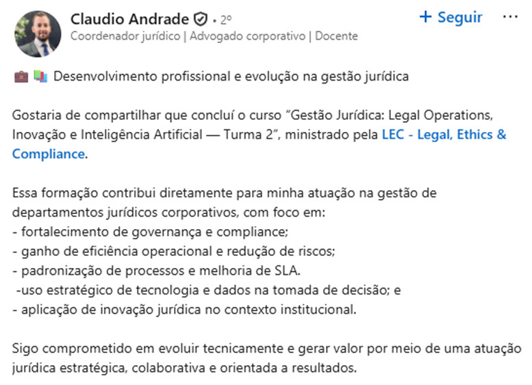 Consultores e profissionais da transformação digital no setor jurídico que precisam de repertório e certificação para ganhar autoridade.